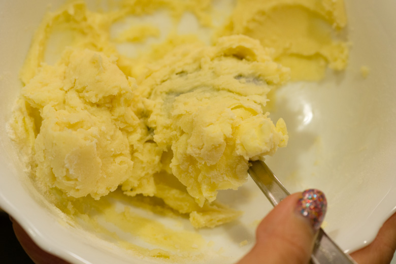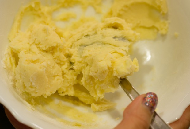 While you wait for your chicken stock to reduce, you can kill time and combine the butter and flour in a small bowl. Mix together with the back of a wooden spoon until a smooth paste forms.