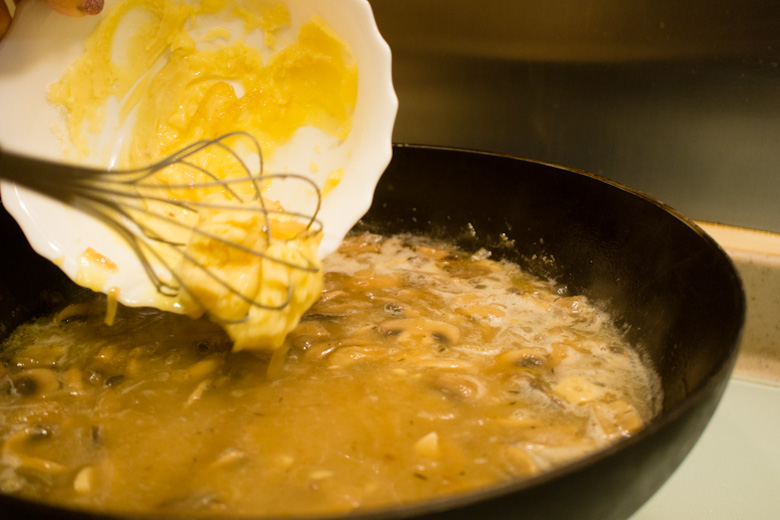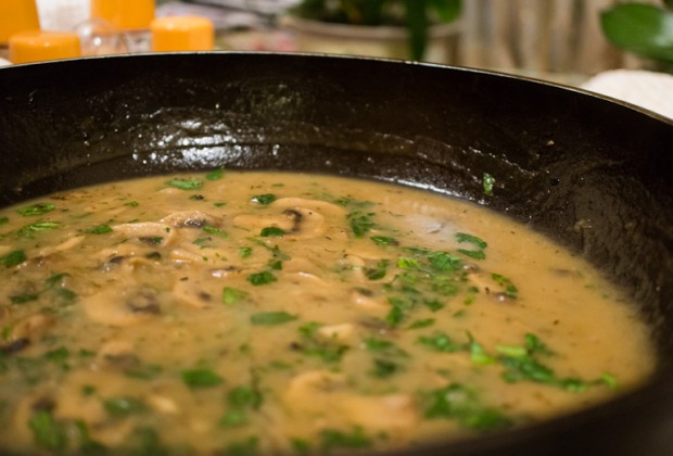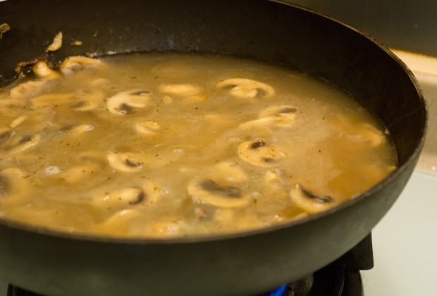 Add 4 cups of chicken stock and continue cooking until the stock is reduced by half, about 25-30 minutes. Keep an eye on your gravy; you don’t want it to over reduce.