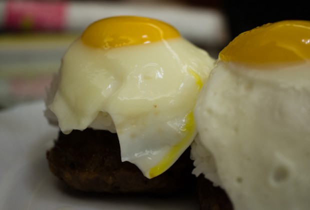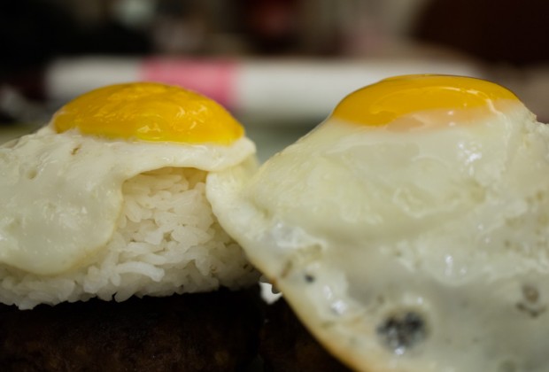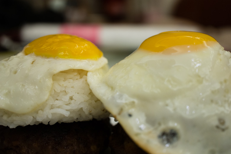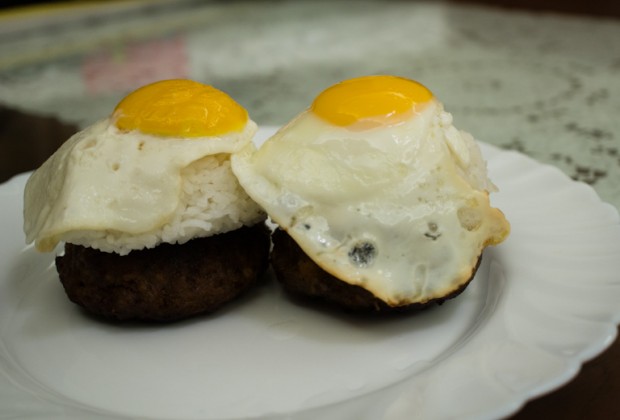 Now time for plating! You can do this anyway you want, but I was going for the traditional Hawaiian plating steez. I packed about half a cup of cooked rice into a small rice bowl and placed them on top of the beef patties creating a little mountain of rice.