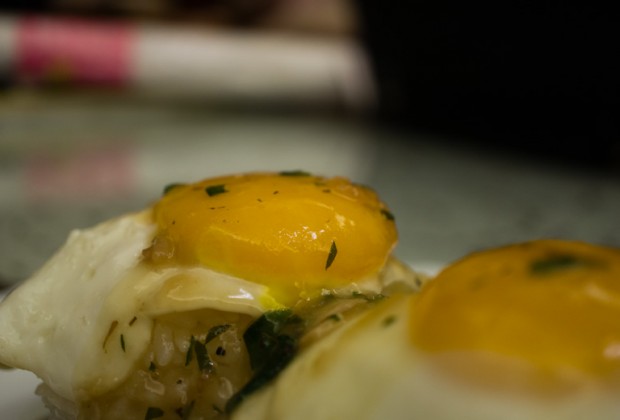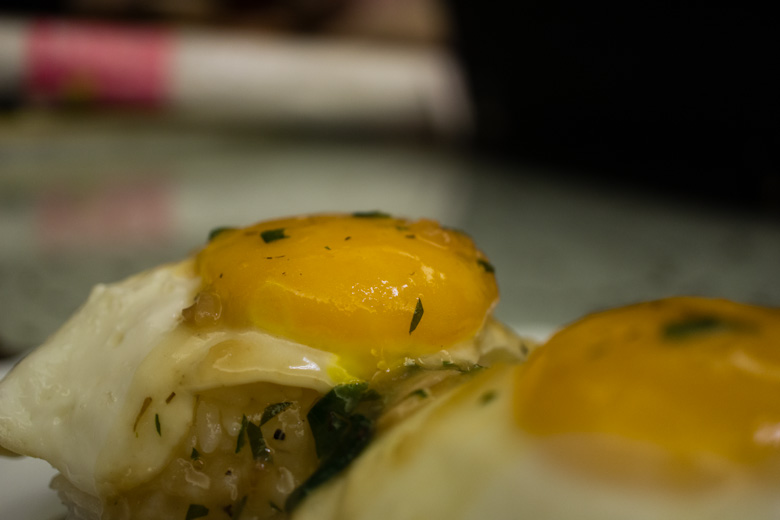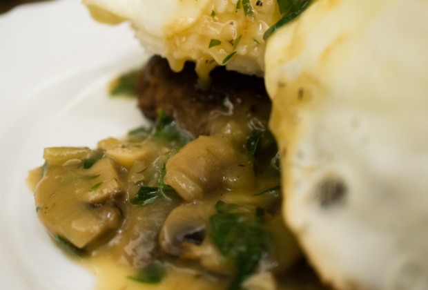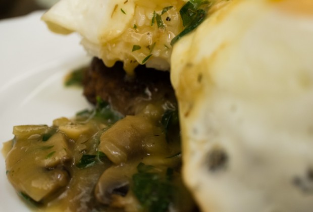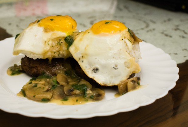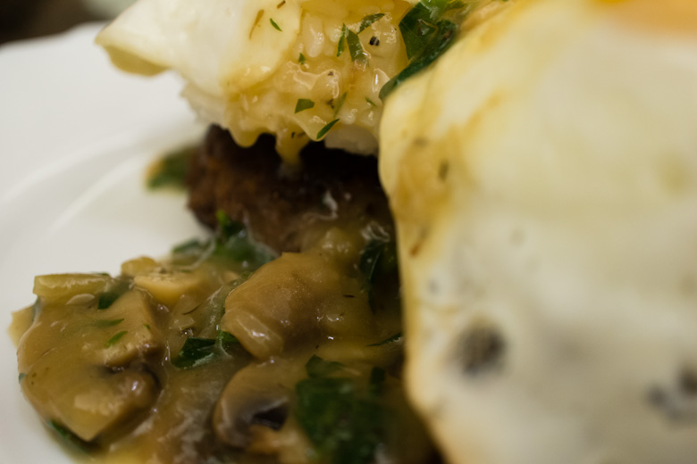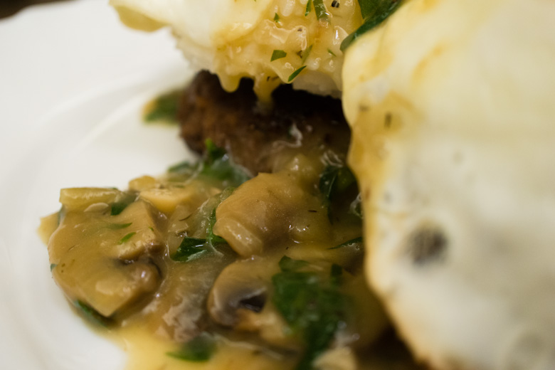 Next, I set the fried eggs on top of rice, carefully so the yolks don’t break. I then generously doused the plate with the mushroom gravy!