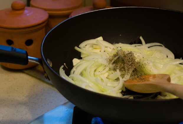 Prep your veggies. 1 large onion, halved and cut into 1/8-inch slices. The onions at my local grocery store were small so I used 2 small onions. 5 cloves of garlic, minced. The recipe doesn’t call for garlic, but I love garlic so I added this just because. Take one pound of button mushrooms, wiped clean and cut into ¼ -inch slices.