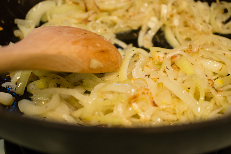 Now, for the gravy! Heat ¼ cup olive oil in a large saucepan over medium heat. Add the onions, salt, and thyme and cook, stirring constantly, until the onions have become soft and translucent, about 10 minutes. I didn’t have any fresh thyme at my Asian grocery store so I used dry thyme. The recipe also says to use 1½ tablespoons of salt, but I only used 2 teaspoons just because the chicken stock I used wasn’t low sodium. I figured I could always add more salt later if necessary.