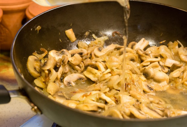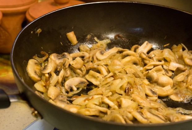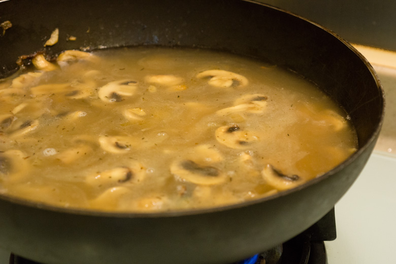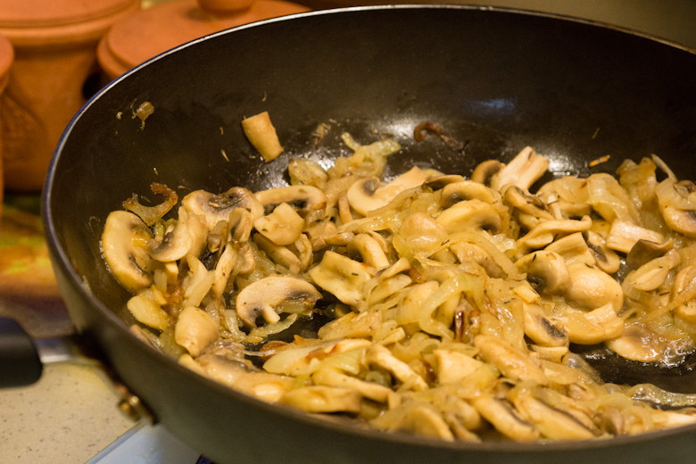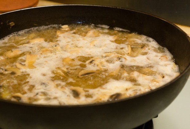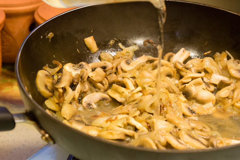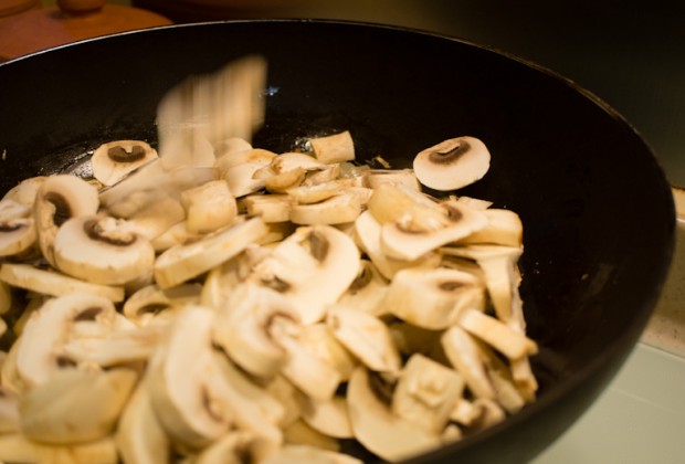 Add the mushrooms and cook until almost all of their liquid has evaporated, about 8-10 minutes.